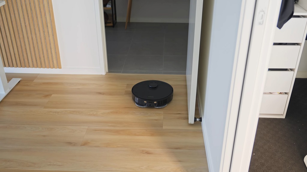 Robot usisivač se automatski vraća na stanicu za punjenje na drvenom podu